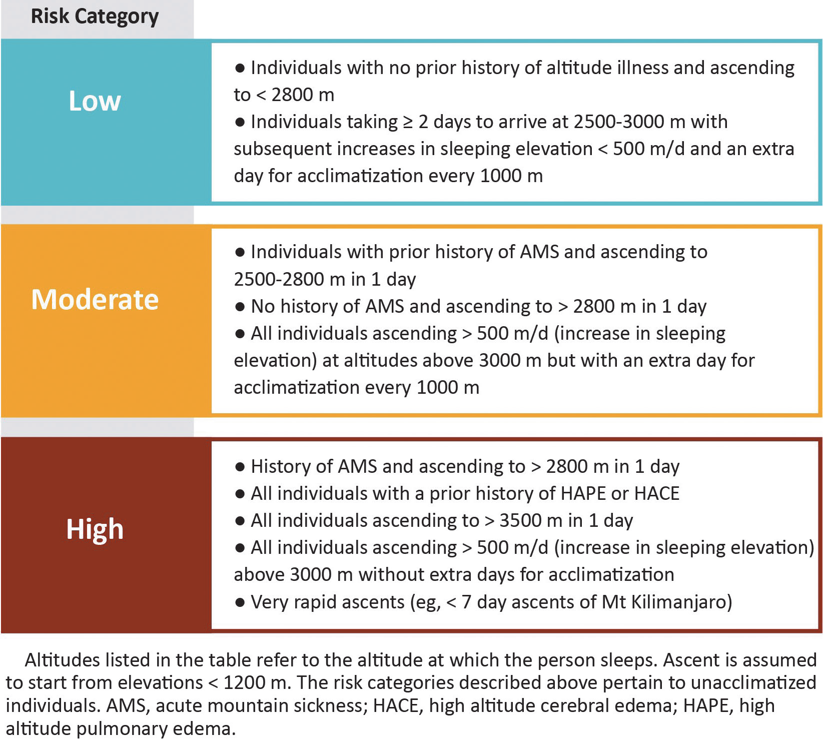 Those in the moderate or high-risk categories may choose to be more conservative in their ascent profiles and include more rest days than typically recommended.